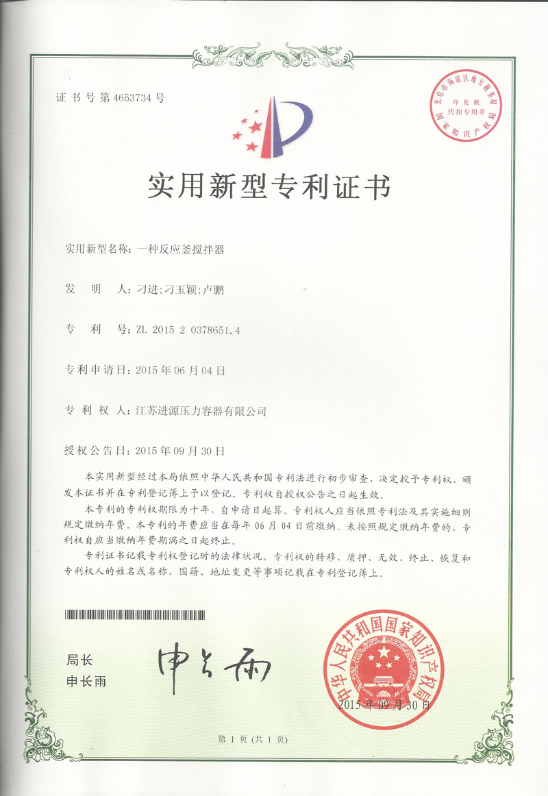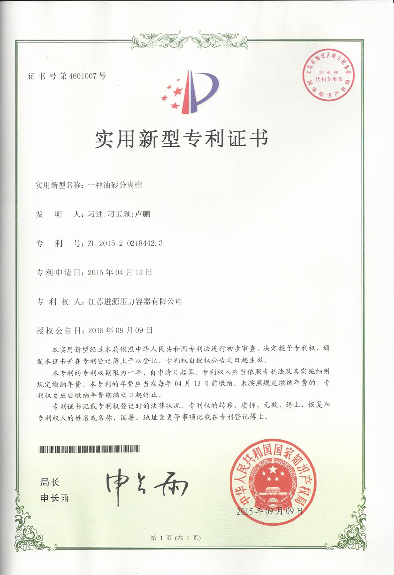 江蘇進(jìn)源壓力容器有限公司自主研發(fā)的“一種油砂分離槽”、“一種反應(yīng)釜攪拌器”、“螺旋板換熱器”、“一種高效節(jié)能蒸發(fā)式冷凝器”等四項創(chuàng)新成果,均獲得國家知識產(chǎn)權(quán)局專利授權(quán),專利期限為十年。另外申報的15項發(fā)明專利也被國家知識產(chǎn)權(quán)局受理。