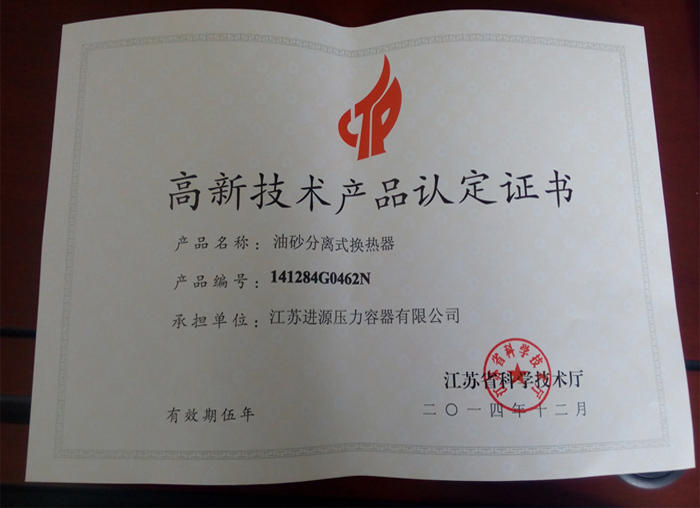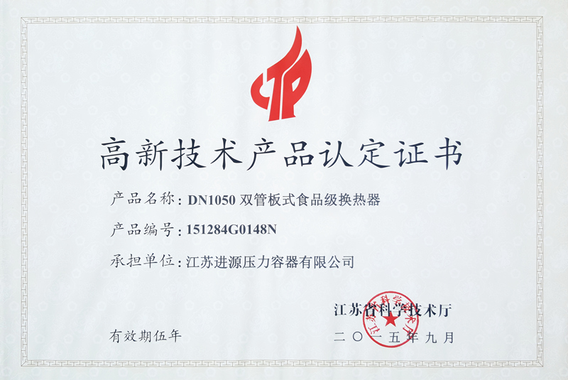 高新技術(shù)產(chǎn)品認定證書-雙管板式食品級換熱器